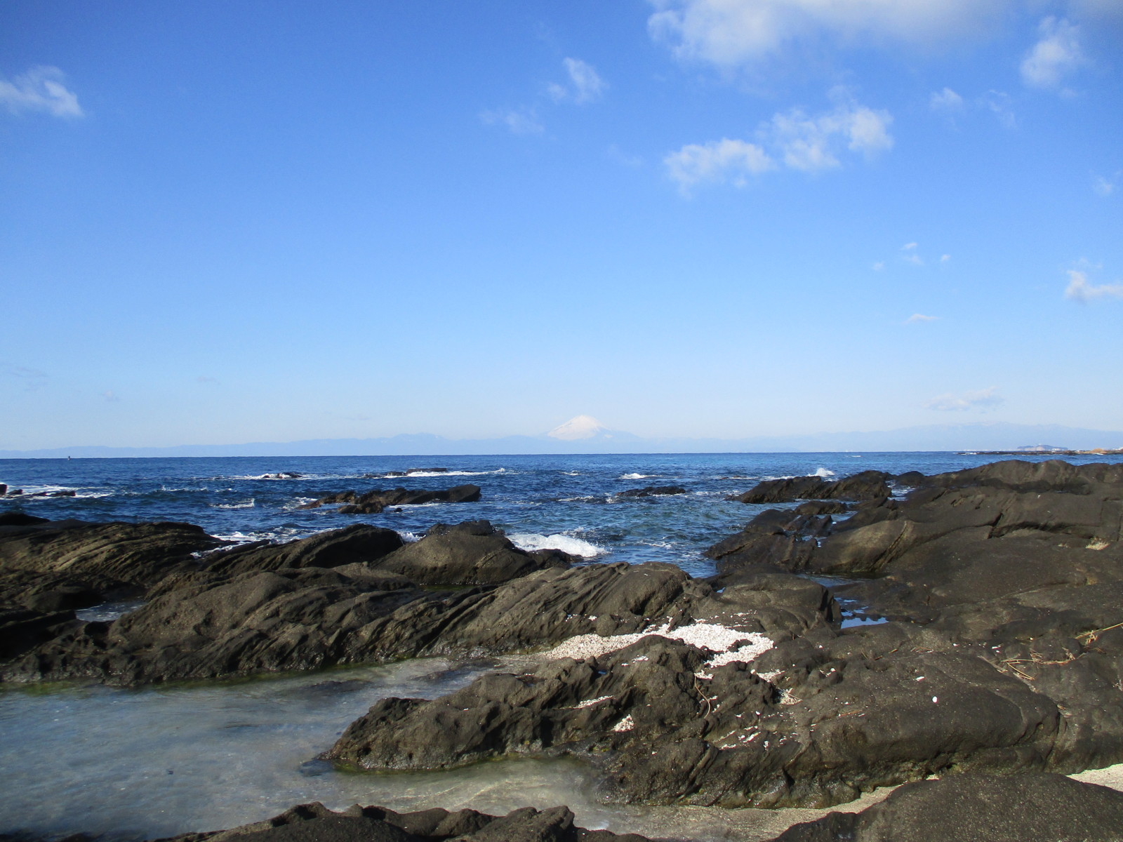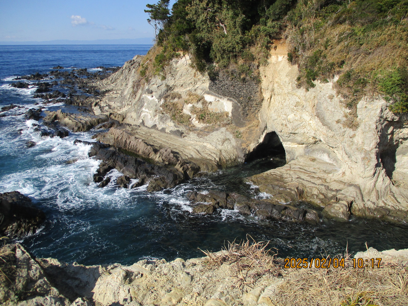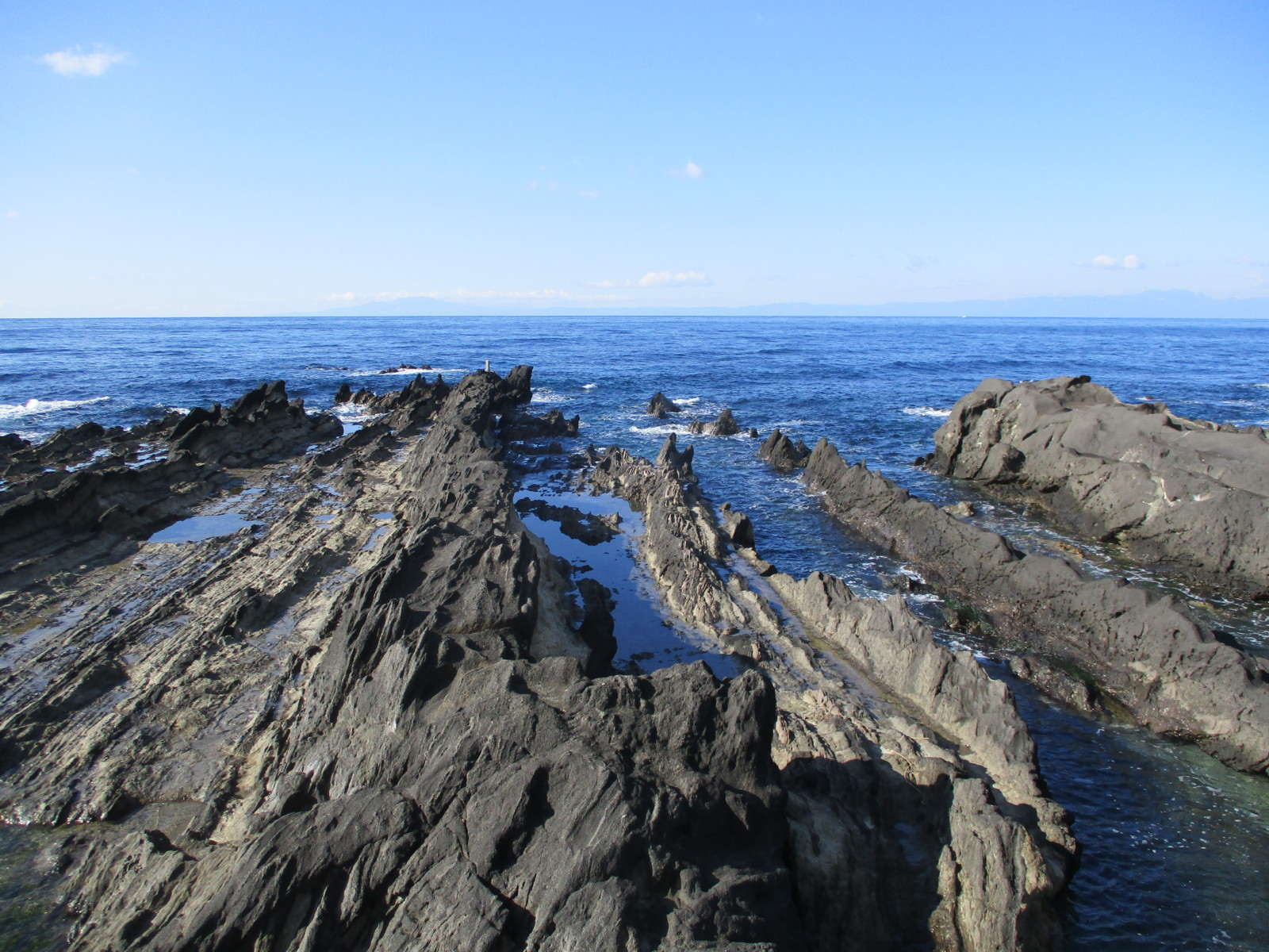 城ヶ島に向かって走る途中、荒崎公園に寄ってみる。 先ず夕日の丘展望台に登る。途中で伊豆大島がよく見えた。 洗濯板のような地形が見られる。これは数千万年前改訂だったころに堆積した硬い凝灰岩と軟らかい砂岩・泥岩の層が隆起して浸食されてできたのだそうだ。 相模湾の向こうには伊豆の天城連山や箱根連山が見える。(先ほどに天神島で見たのと変わりはないが・・・) 撮影ポイントに行くと洞窟が見られる。 |