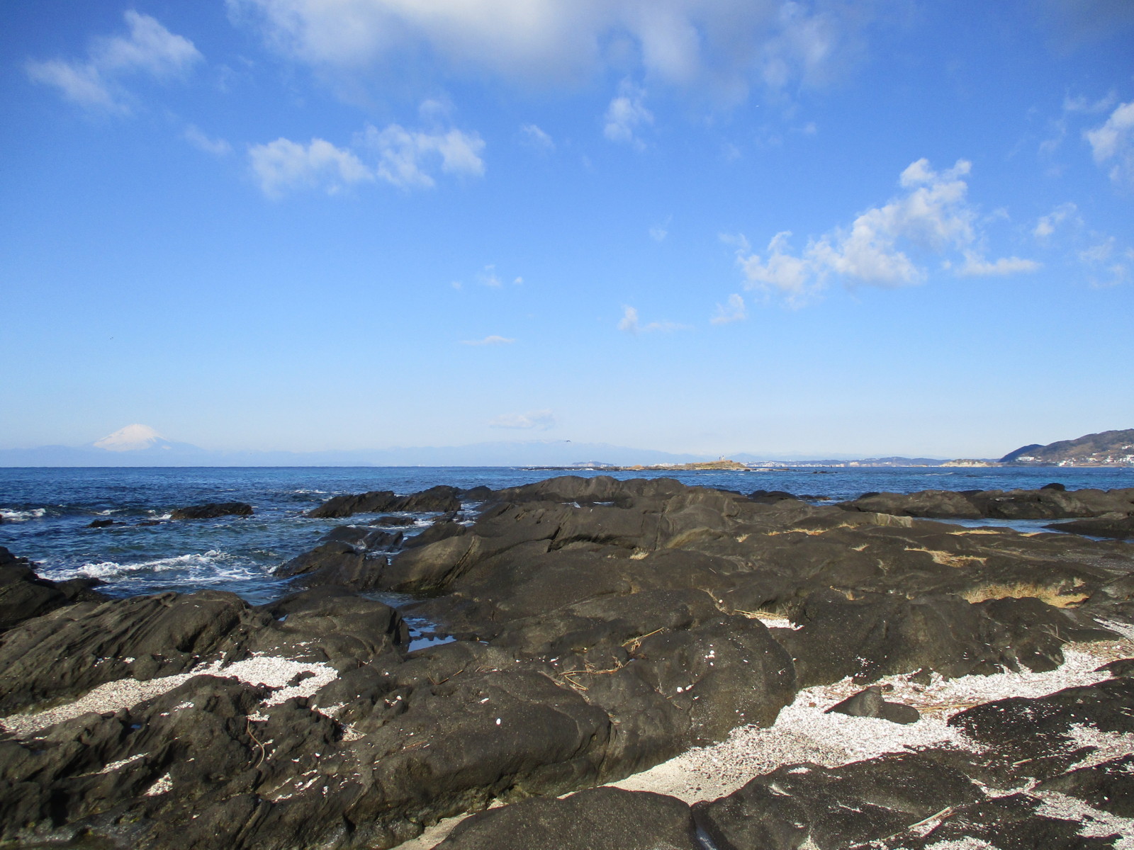 天神島の南西部の海岸に遊歩道があり島をほぼ半周する。 伊豆半島、箱根連山、富士山、丹沢山塊がよく見える。 中央は丹沢山塊 |