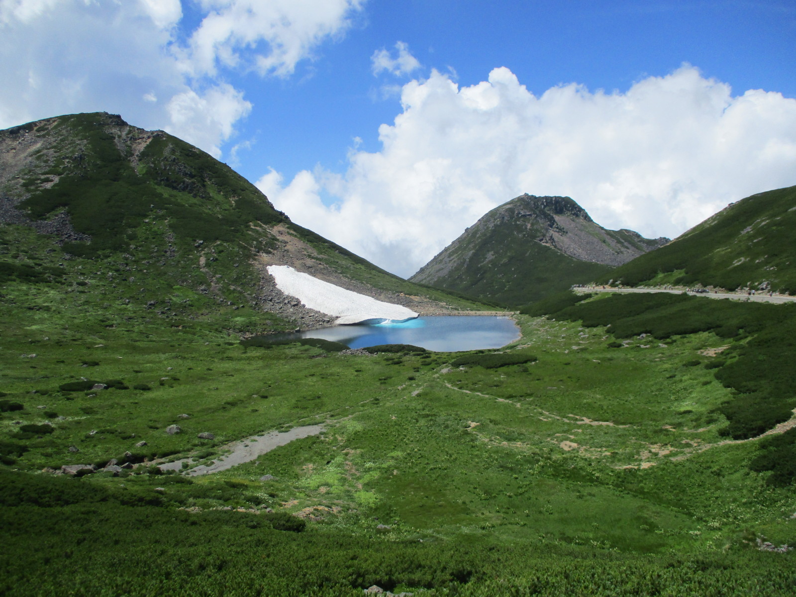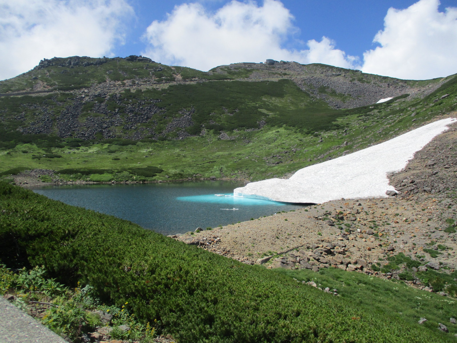 9:52 | 15分くらい登ったところで、振り返ると、畳平と恵比須岳、亀ヶ池がよく見える。 前方右に雪渓が見えてきた。 不消ヶ池にはいった部分の水の色が何とも言えぬ魅力的な色だった。 |