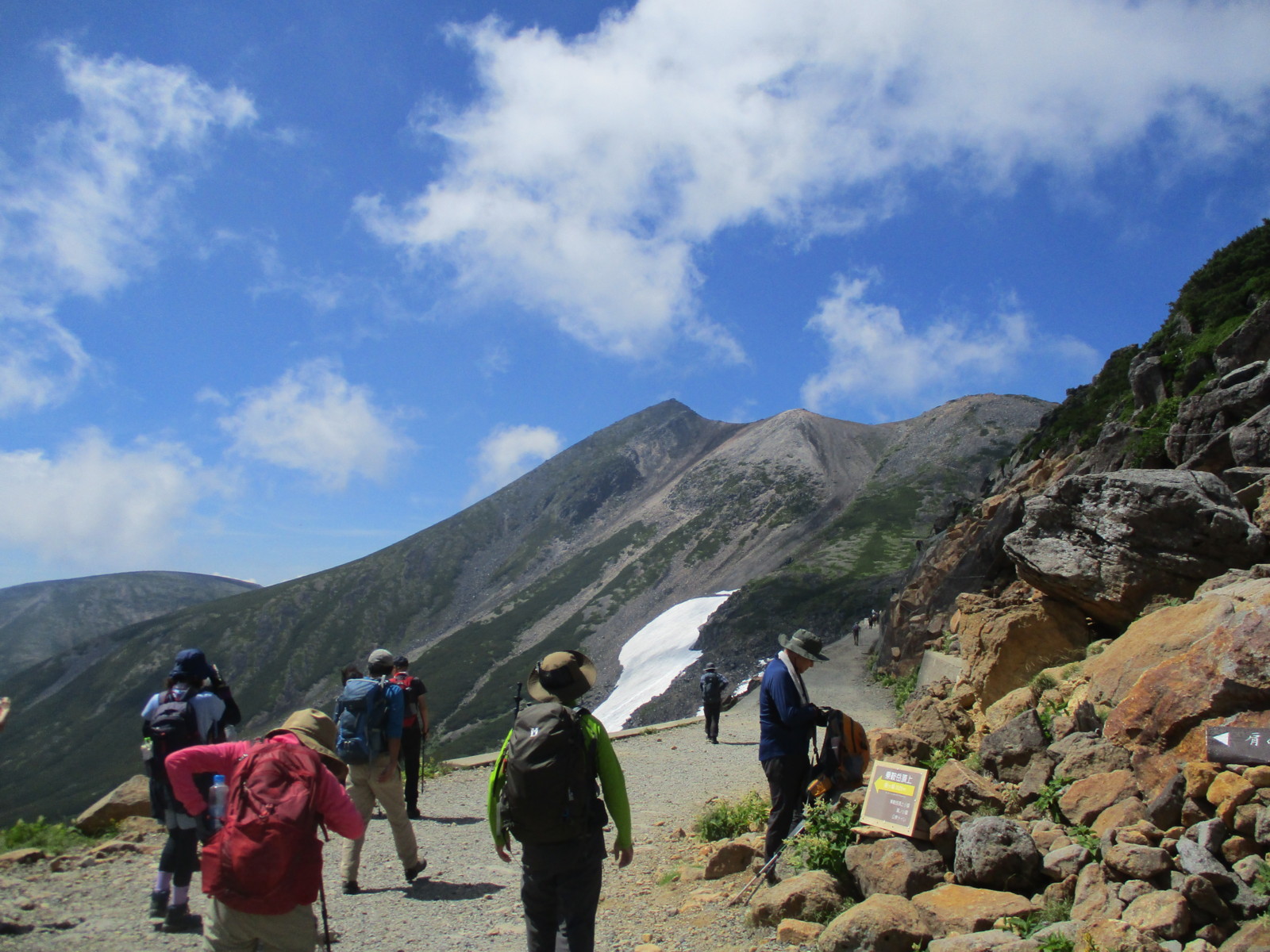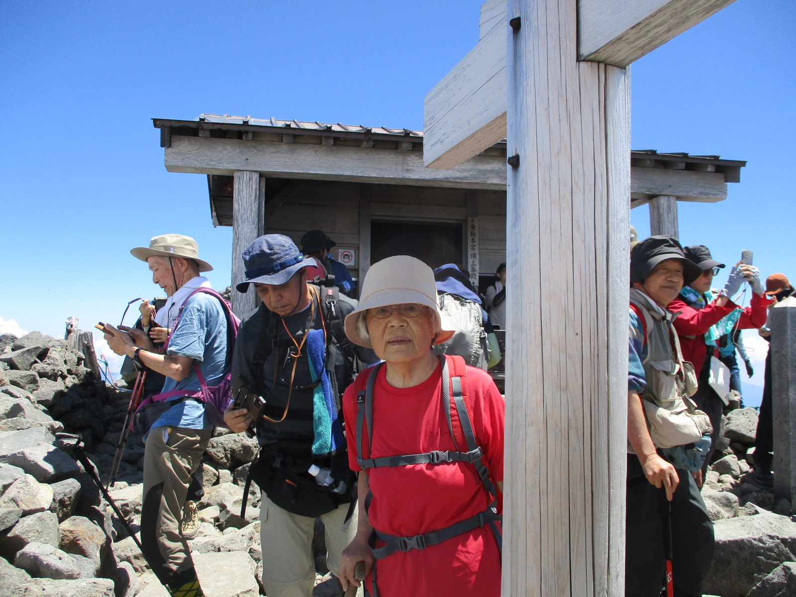肩の小屋で少し休憩してから、いよいよ剣が峰への登山道に入る。 登り口の近くに大勢人がいる。ライチョウがいた。 少し登ったところで休憩。左を見ると鉢盛山が見えた。この向こうに八ヶ岳があるが、雲で見えない。 |