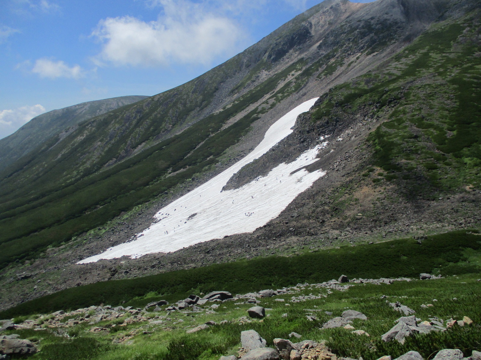 摩利支天岳への分岐を過ぎ不消ヶ池が見える。 池に入った雪渓の色はやはり素晴らしい。 不消ヶ池の少し下に熊がいるのが見えた。 |