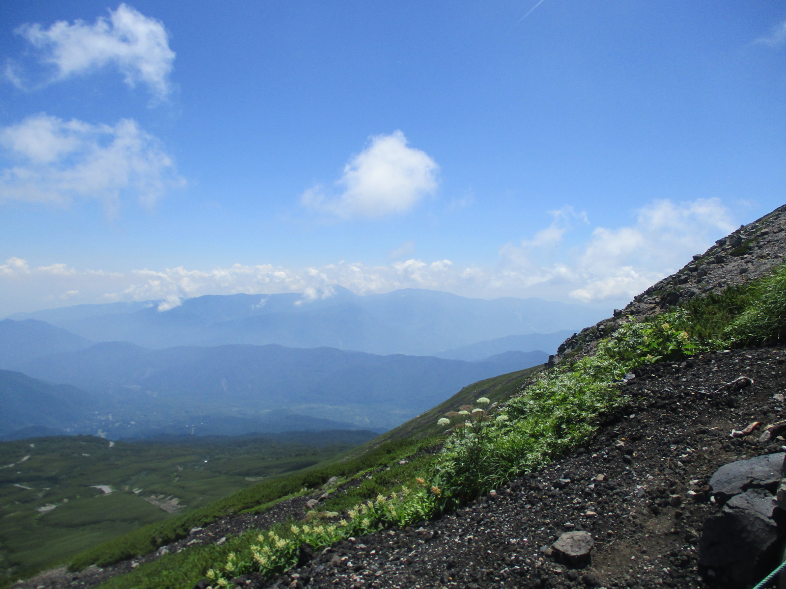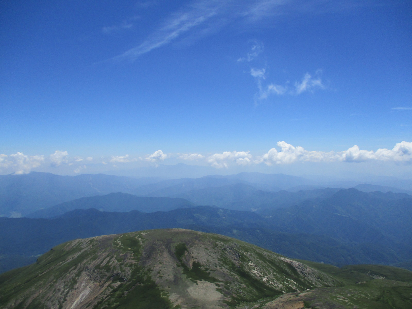 頂上直前で後を振り返ると摩利支天岳の右に歩いてきた道が見える。右下には乗鞍高原への道路が見える。 北アルプスは残念ながら雲に隠れてしまっている。 南東の方向を望むと規格の山はよく見えているが、遠方の中央アルプスや南アルプスは見えない。 |