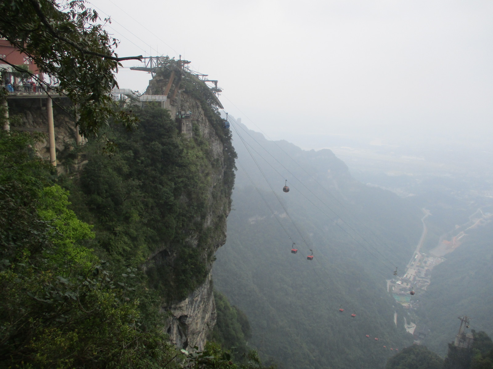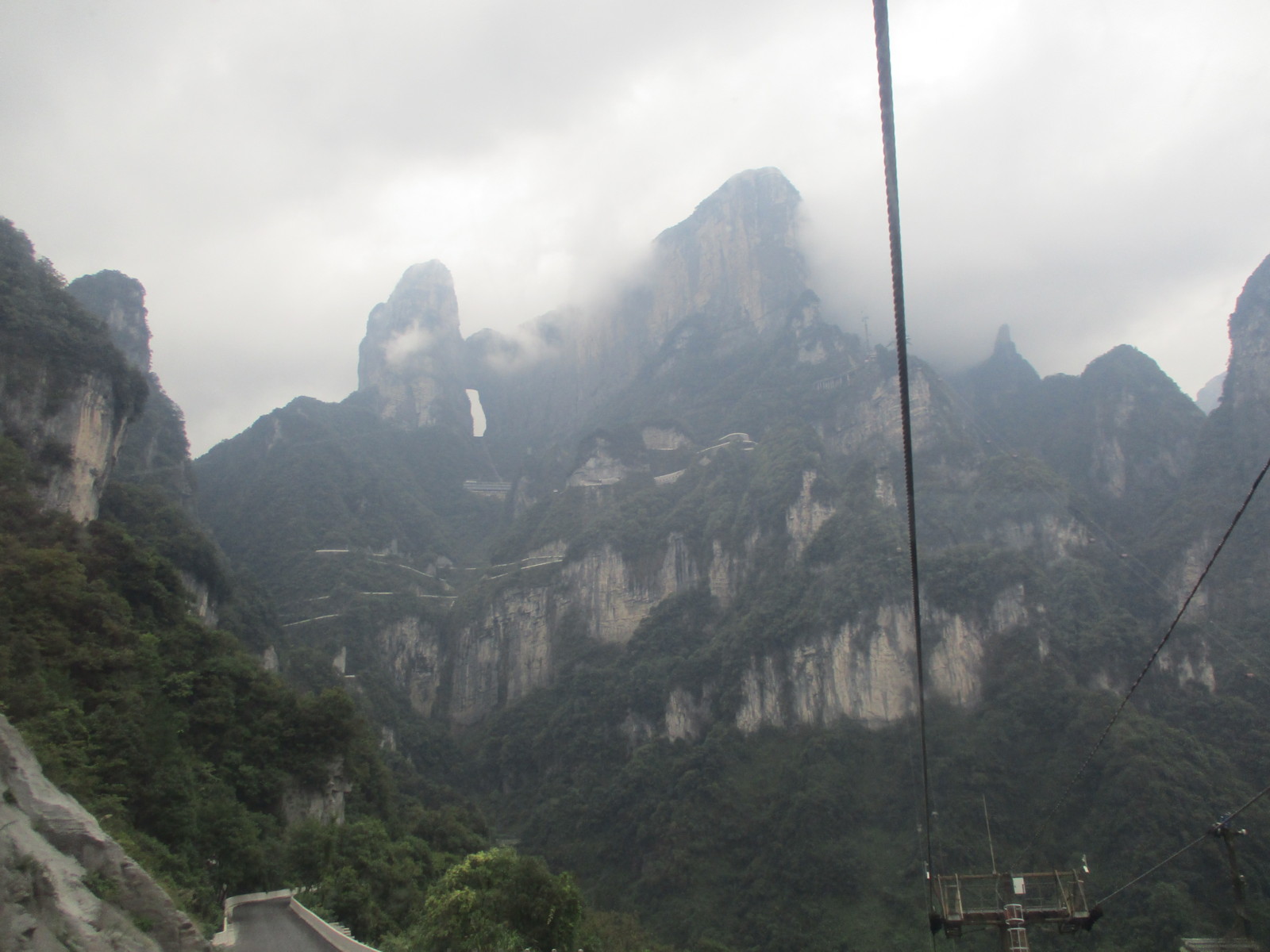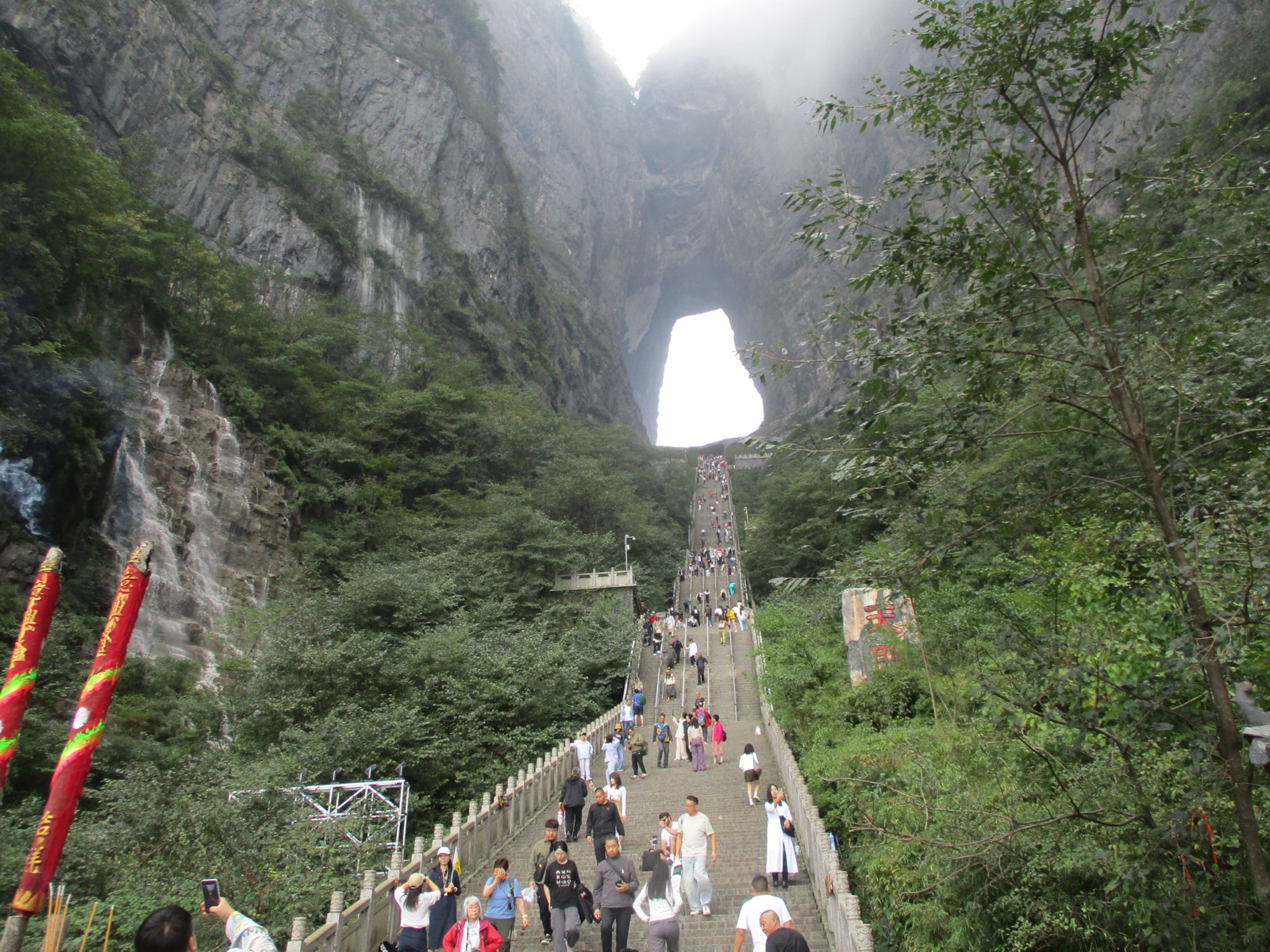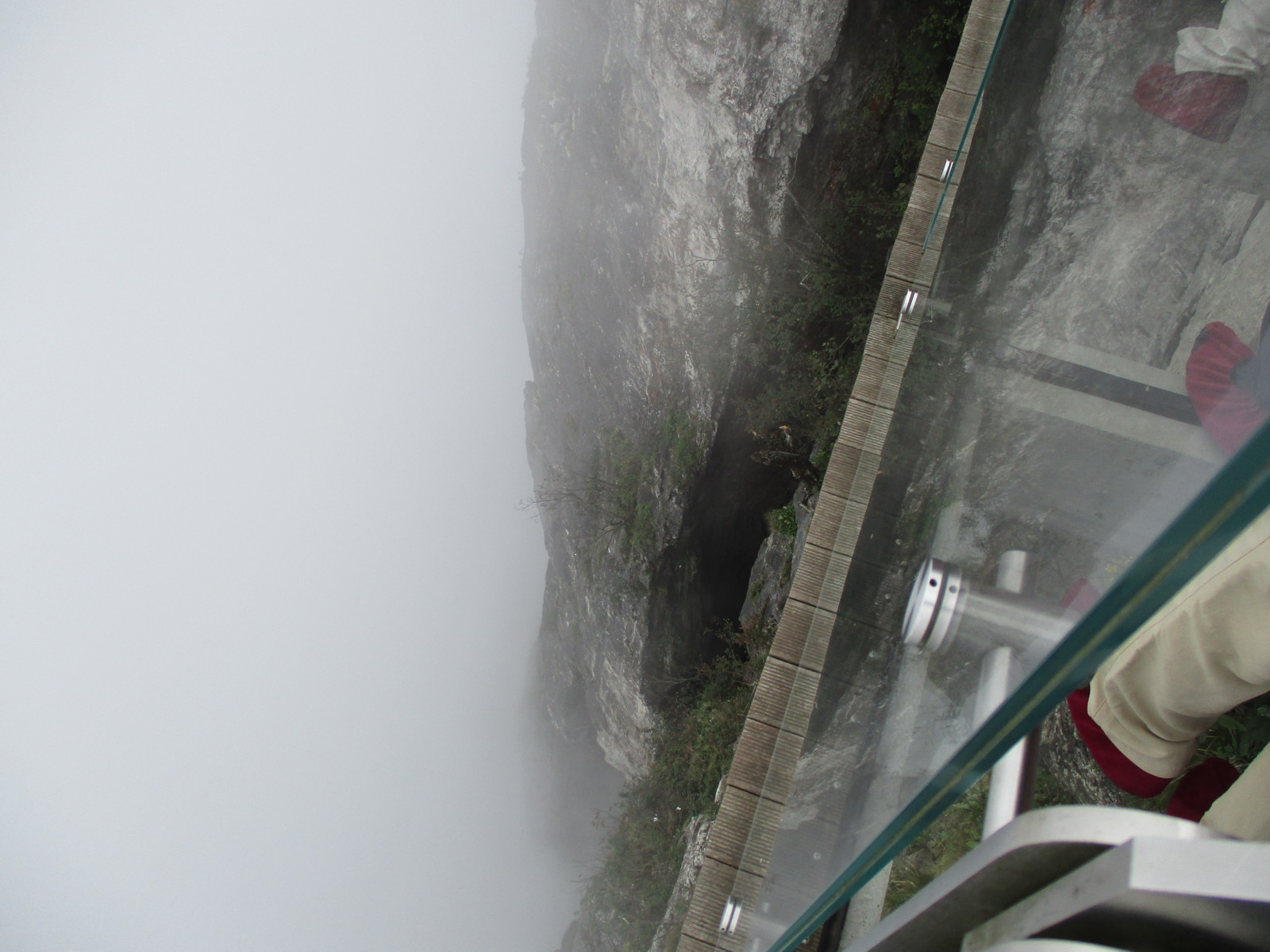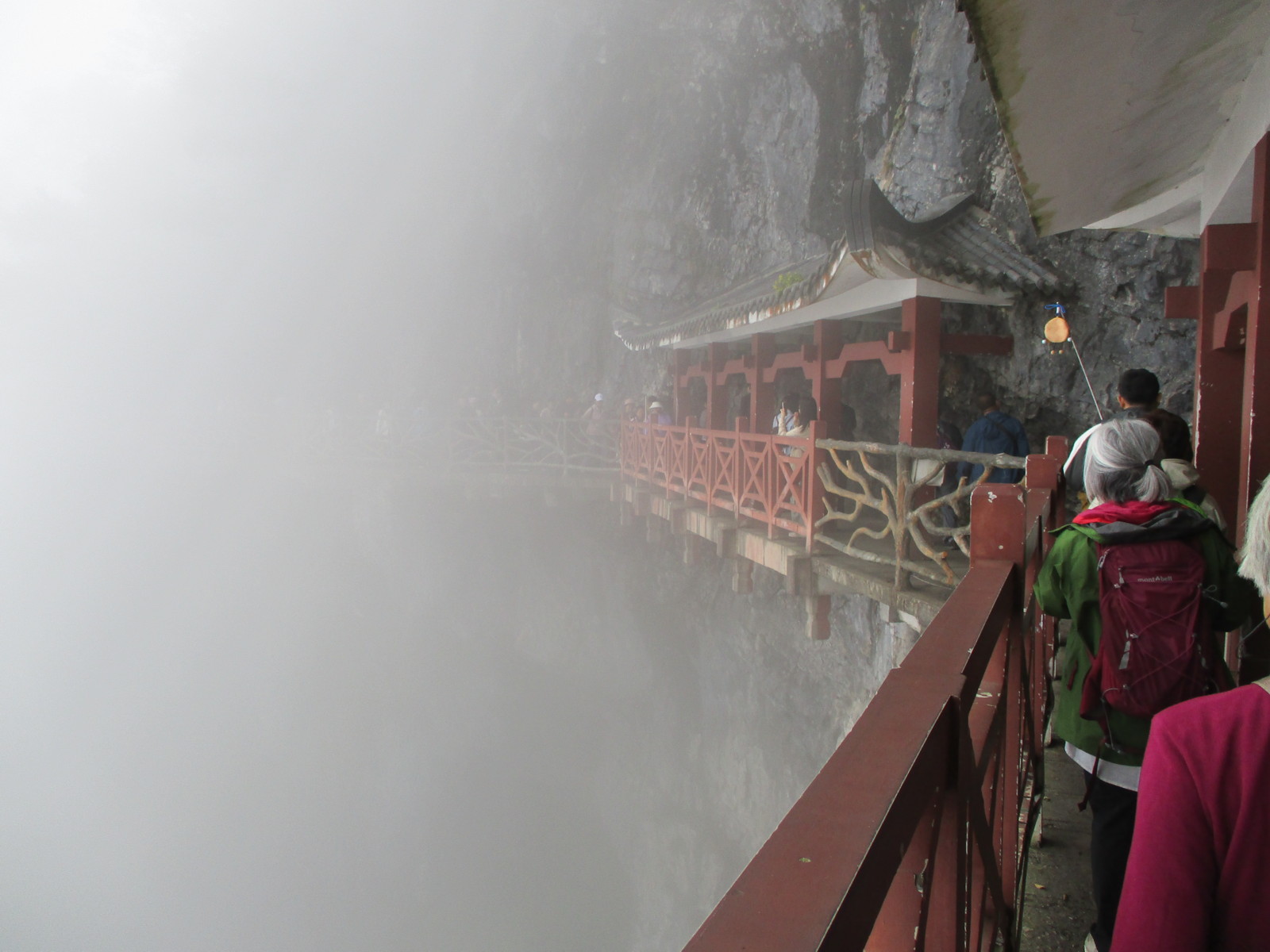 | 街の中心部近くから世界一長いロープウエイに乗って天門山へ。 天門洞が見える。 下りの時に乗るロープウエイも見える。 ガラスの道へ。 ?桐園 ガラスを傷つけないためにかすべらないためか靴カバーを手渡される。 霧のため辛うじて下が見える程度なのであまり怖さは感じない。 一瞬、霧が薄くなって下がちょっと見えた。 霧の中をエスカレーターの乗り場へと進む。 下りのエスカレーターに乗る前に天子山の頂上を見る。霧に隠れたり見えたりしていた。 次は長〜いエスカレーターで下る。 岩山の中を7基乗り継いでやっと外に出たらそこは天門洞。 張家界の街とは反対側が見えた。 手を伸ばして写真を撮ったら洞がかろうじて写った。 落石で死者が出たので通路を引っ込めたため見えなくなったのだそうだ。 天門洞の中から見る。下には水が張られている。 999段の上。エスカレーター(有料)で下りられるが全員徒歩を選ぶ。 途中足の悪いAJさんが心配で皆が見上げているとタイミング良くボトルを落としコロコロ転がる。 帰りは行きより少し短い西のロープウエイを使う。 |