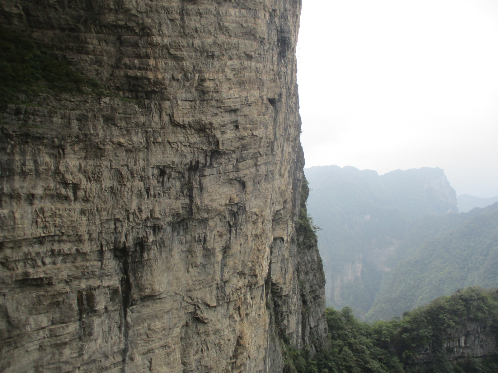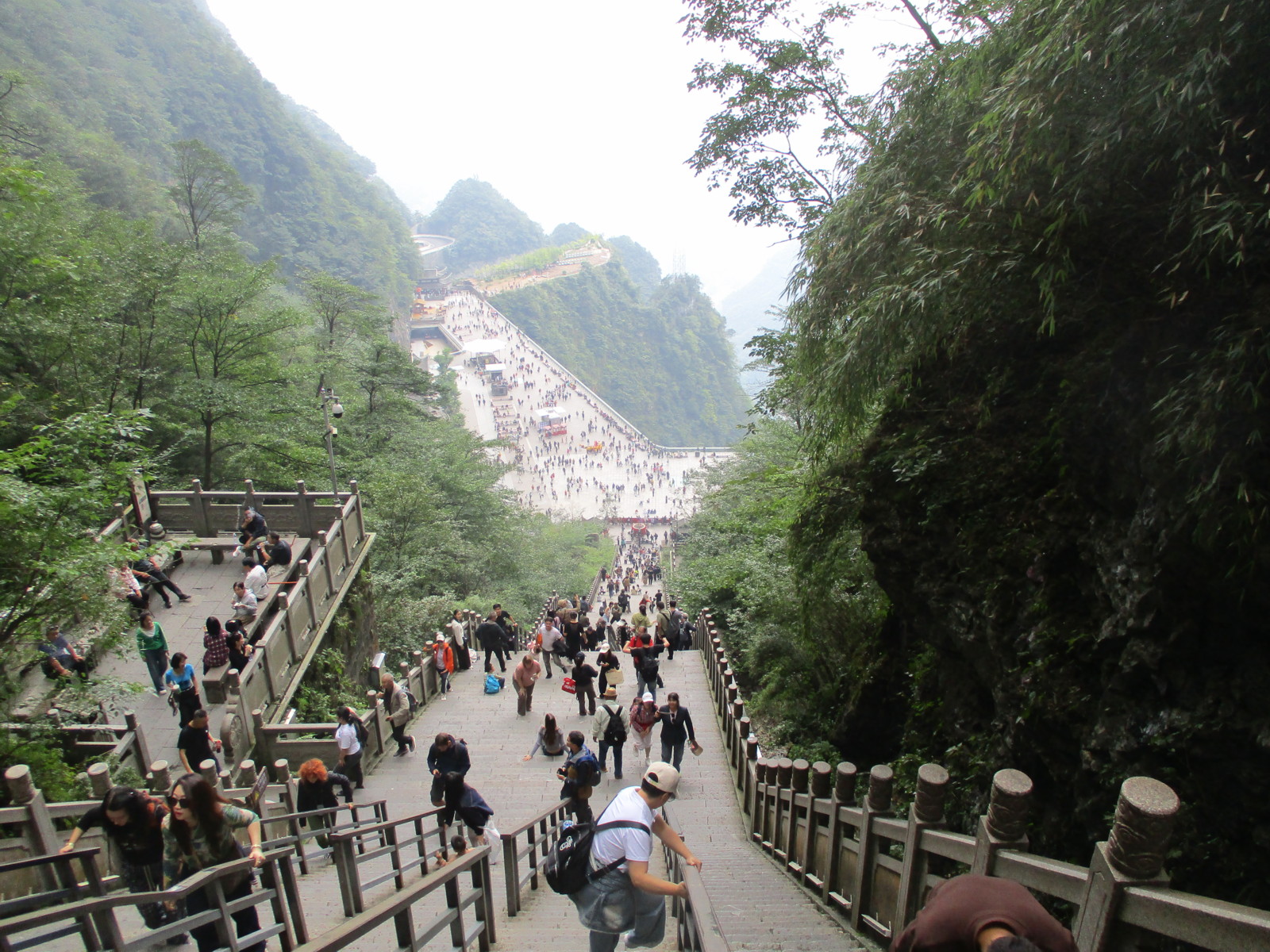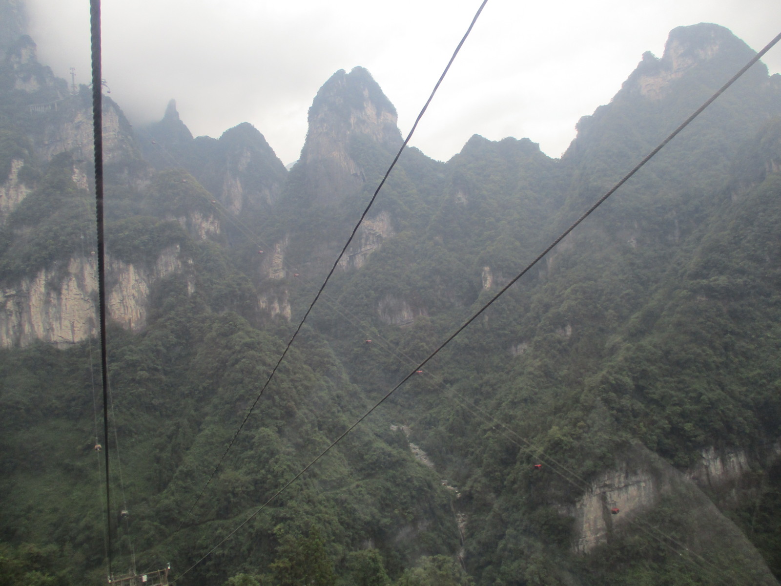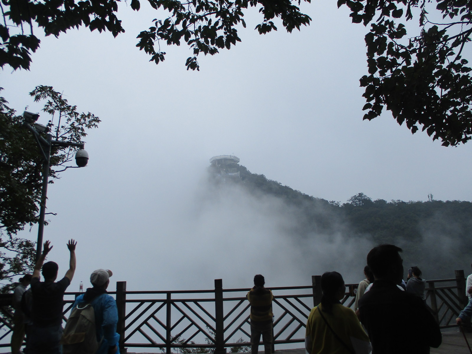 | 街の中心部近くから世界一長いロープウエイに乗って天門山へ。 天門洞が見える。 下りの時に乗るロープウエイも見える。 ガラスの道へ。 ?桐園 ガラスを傷つけないためにかすべらないためか靴カバーを手渡される。 霧のため辛うじて下が見える程度なのであまり怖さは感じない。 一瞬、霧が薄くなって下がちょっと見えた。 霧の中をエスカレーターの乗り場へと進む。 下りのエスカレーターに乗る前に天子山の頂上を見る。霧に隠れたり見えたりしていた。 次は長〜いエスカレーターで下る。 岩山の中を7基乗り継いでやっと外に出たらそこは天門洞。 張家界の街とは反対側が見えた。 手を伸ばして写真を撮ったら洞がかろうじて写った。 落石で死者が出たので通路を引っ込めたため見えなくなったのだそうだ。 天門洞の中から見る。下には水が張られている。 999段の上。エスカレーター(有料)で下りられるが全員徒歩を選ぶ。 途中足の悪いAJさんが心配で皆が見上げているとタイミング良くボトルを落としコロコロ転がる。 帰りは行きより少し短い西のロープウエイを使う。 |