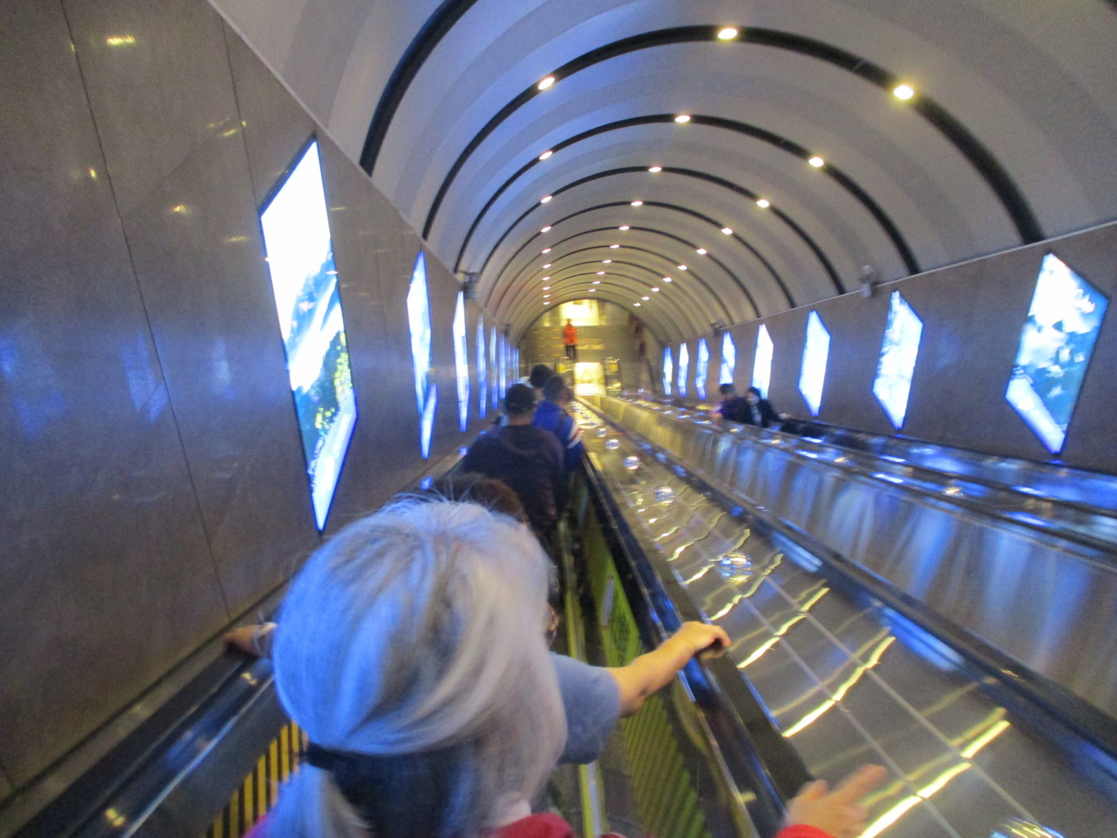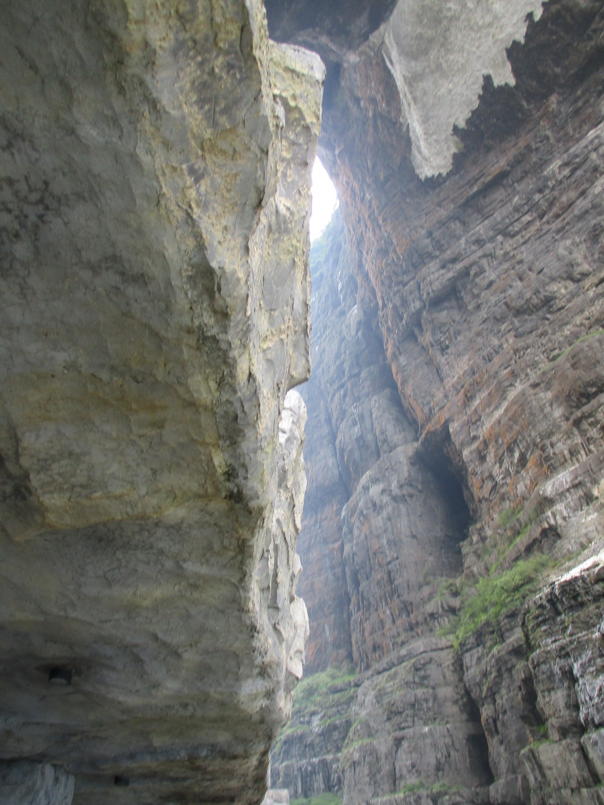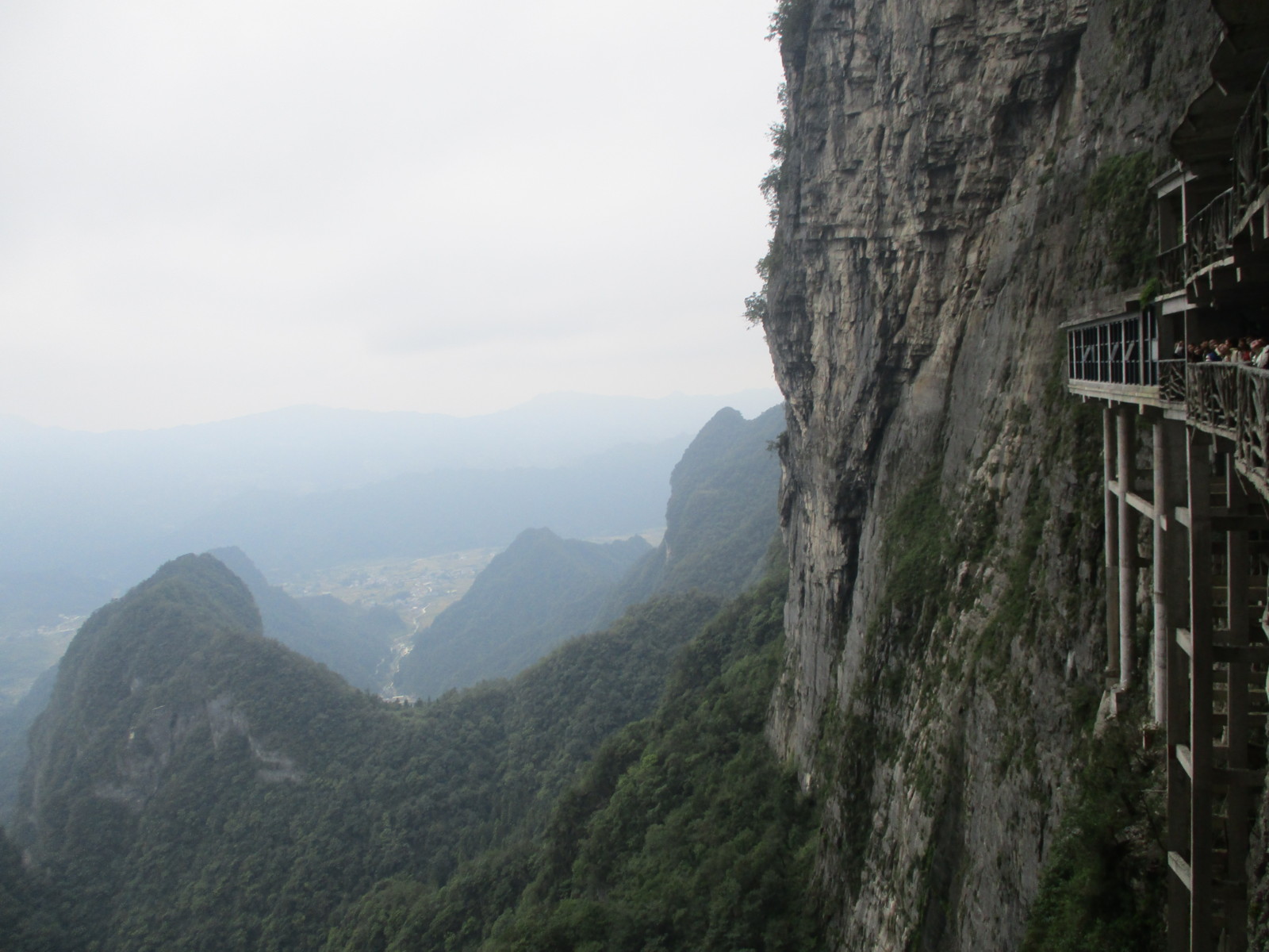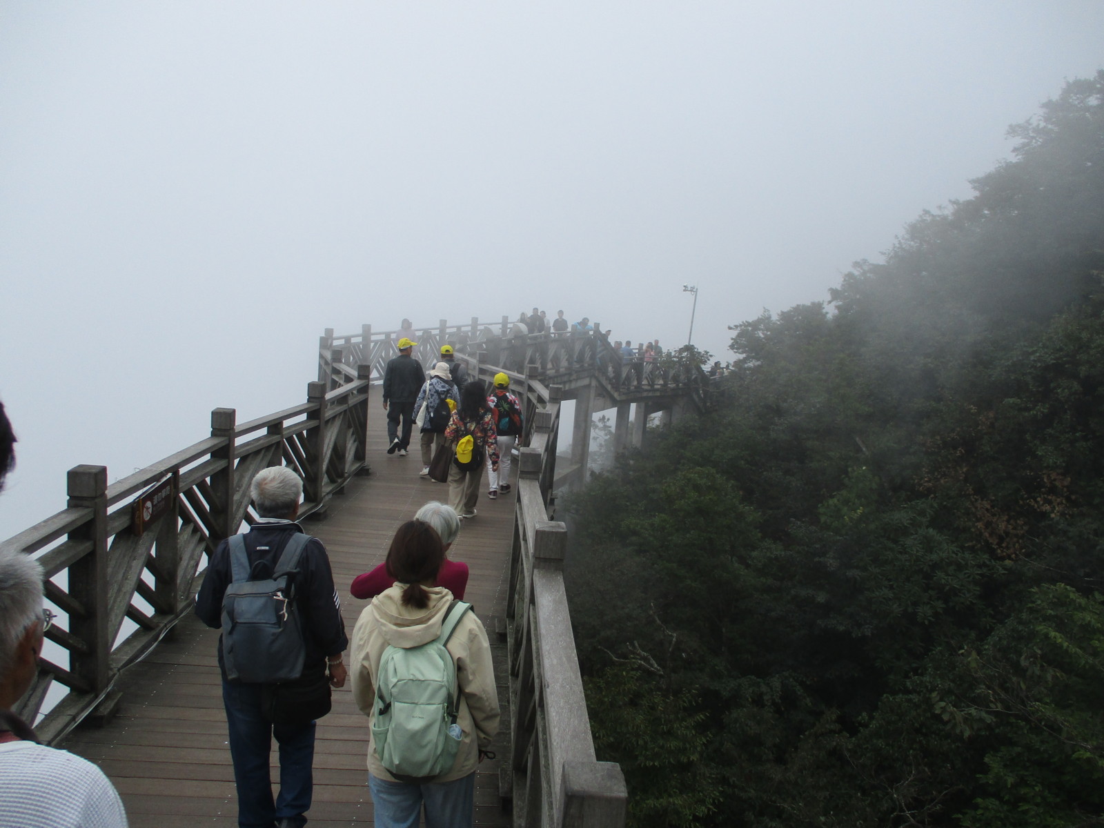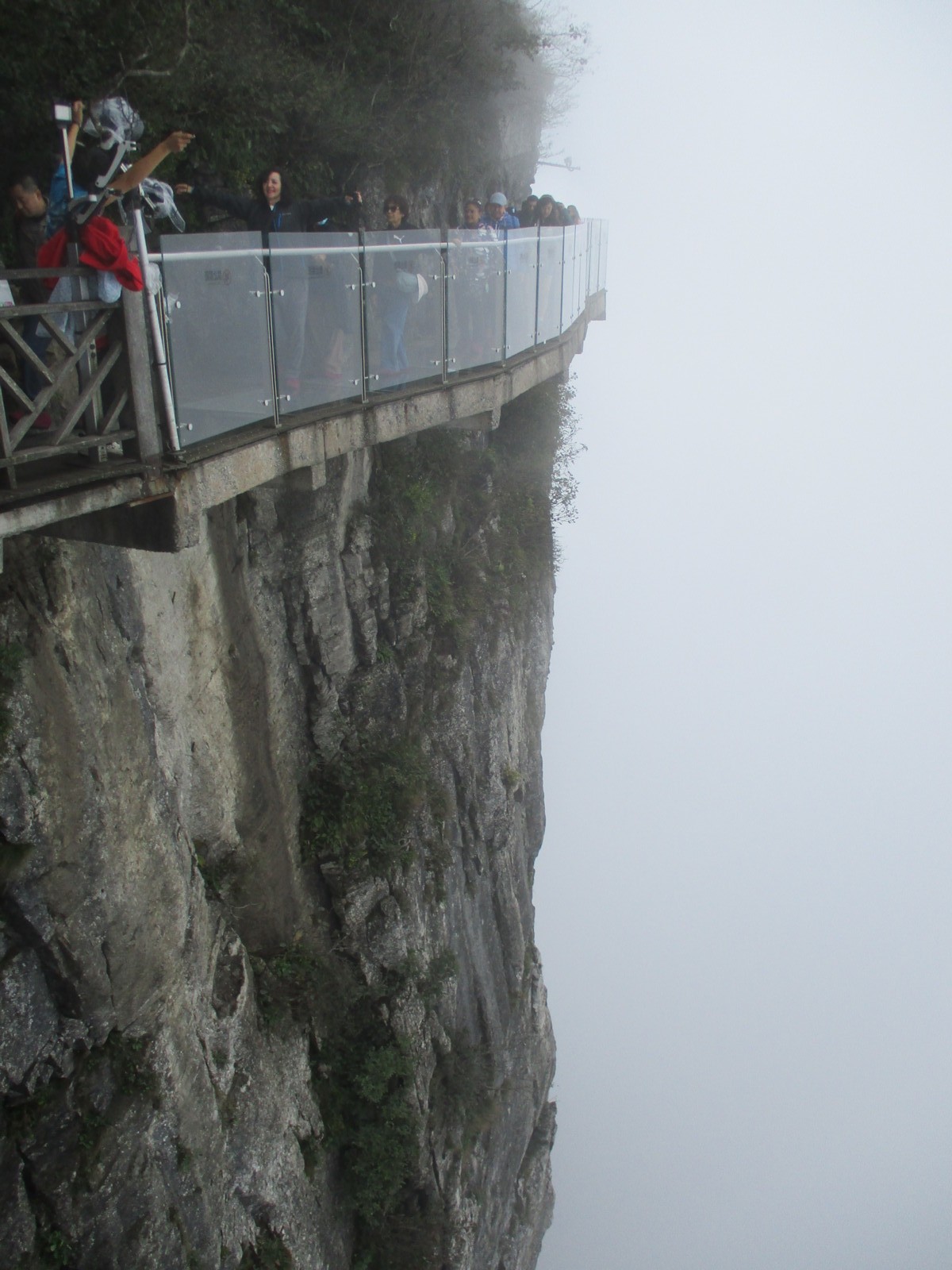 | 街の中心部近くから世界一長いロープウエイに乗って天門山へ。 天門洞が見える。 下りの時に乗るロープウエイも見える。 ガラスの道へ。 ?桐園 ガラスを傷つけないためにかすべらないためか靴カバーを手渡される。 霧のため辛うじて下が見える程度なのであまり怖さは感じない。 一瞬、霧が薄くなって下がちょっと見えた。 霧の中をエスカレーターの乗り場へと進む。 下りのエスカレーターに乗る前に天子山の頂上を見る。霧に隠れたり見えたりしていた。 次は長〜いエスカレーターで下る。 岩山の中を7基乗り継いでやっと外に出たらそこは天門洞。 張家界の街とは反対側が見えた。 手を伸ばして写真を撮ったら洞がかろうじて写った。 落石で死者が出たので通路を引っ込めたため見えなくなったのだそうだ。 天門洞の中から見る。下には水が張られている。 999段の上。エスカレーター(有料)で下りられるが全員徒歩を選ぶ。 途中足の悪いAJさんが心配で皆が見上げているとタイミング良くボトルを落としコロコロ転がる。 帰りは行きより少し短い西のロープウエイを使う。 |
