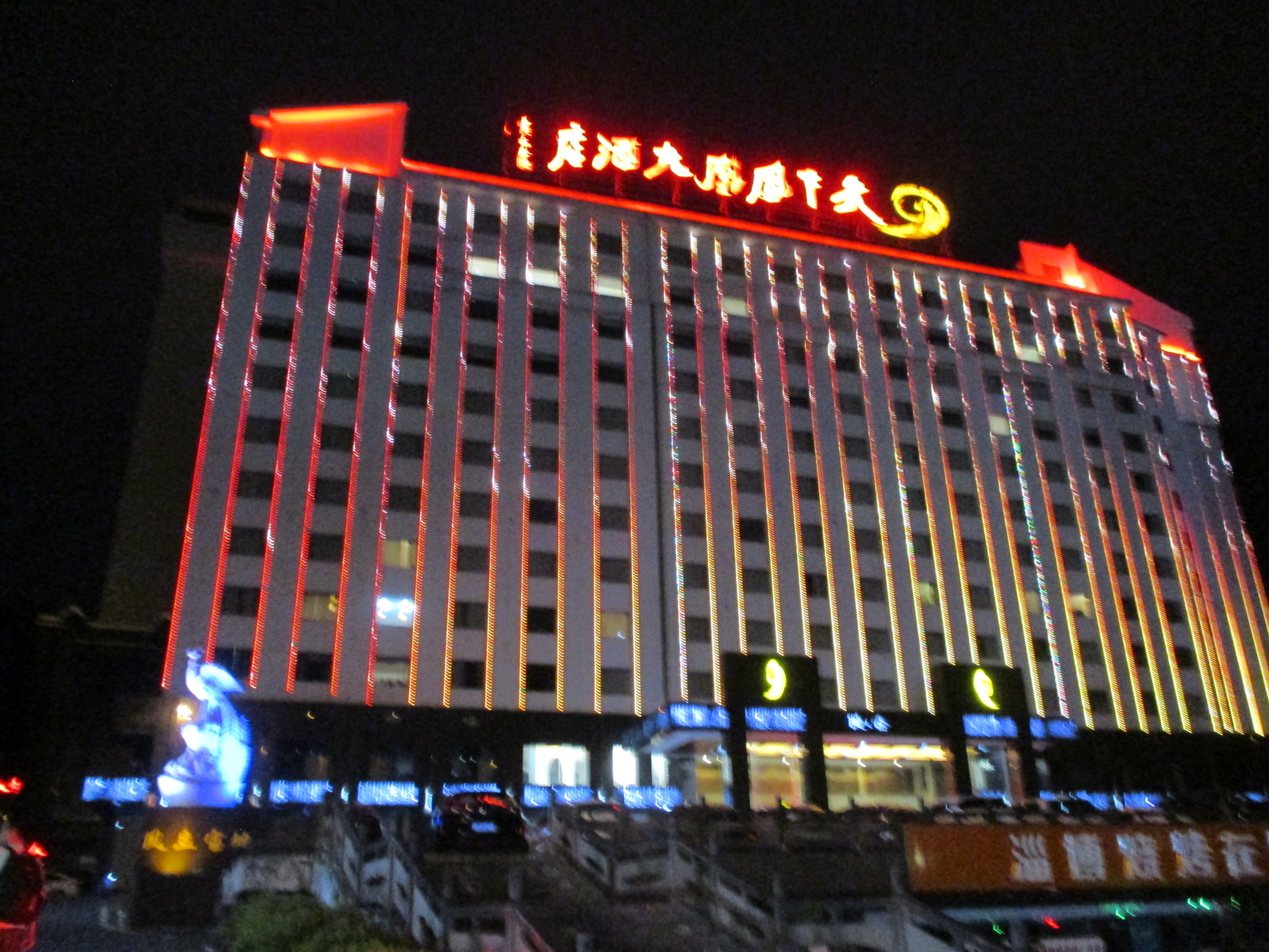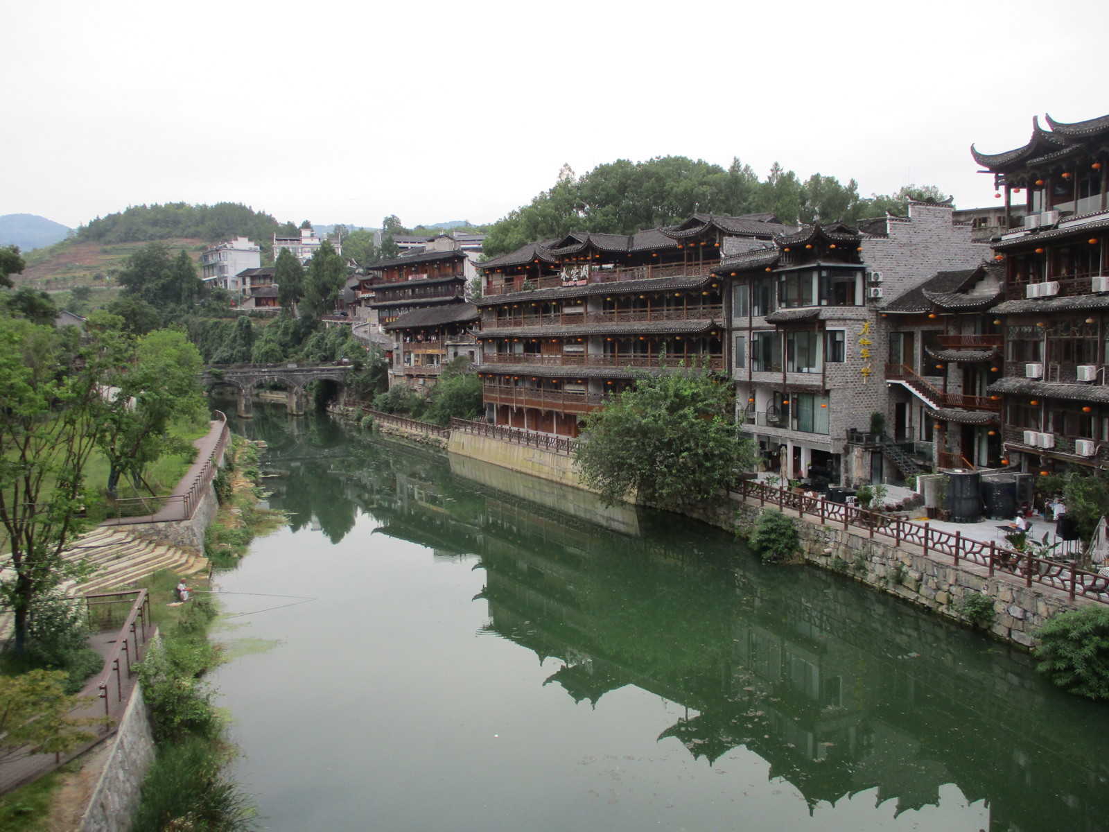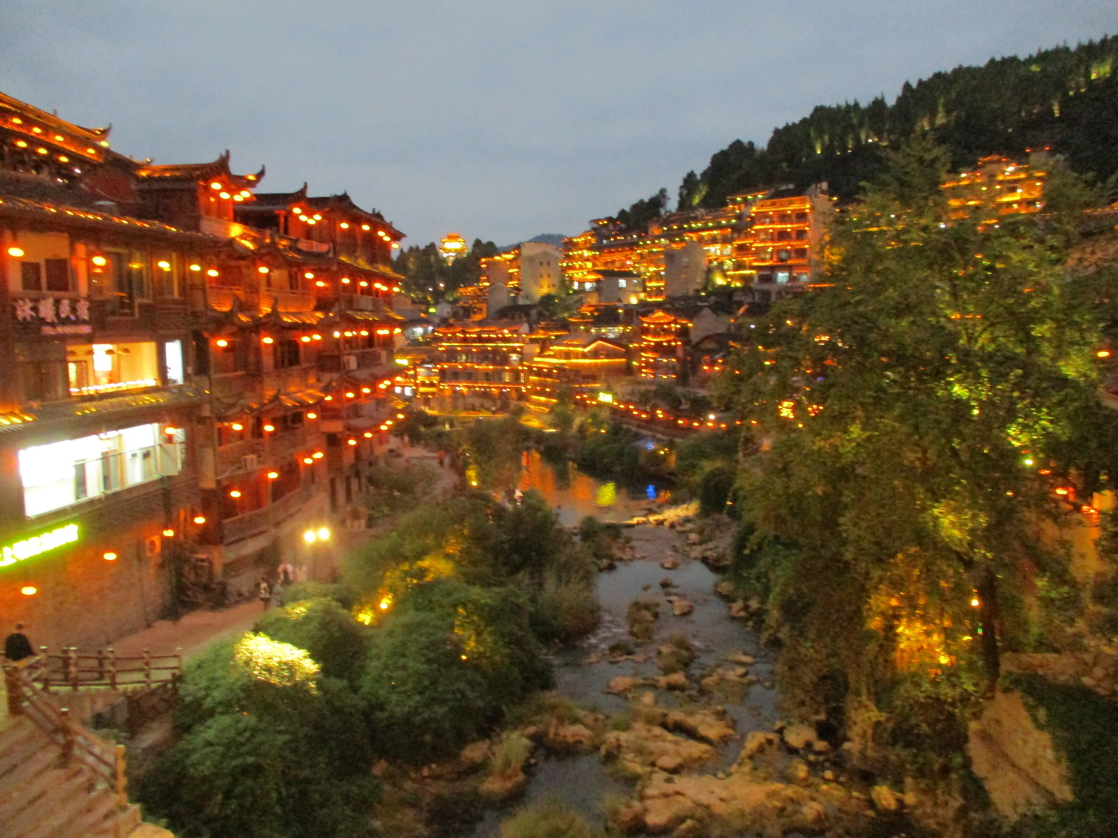 | 昼食の後、芙蓉鎮へ。 入口にあるアイスクリームやさん(密雪水城)でソフトクリームを買う。皆は一個私達は二人で一個。2元。 立ち食いしてから歩き始める。 酉水(ゆうすい)川沿いにある。 今まで高地だったので涼しかったがここは歩くと暑い。二重の滝がきれい。 レストランで食事。暑いのでクーラーを入れてもらう。 日暮れを待って先程の滝の夜景を見に行く。 曹さんは「どいなか」と言うがとんでもない。電線は地中に埋められているしたいしたものだ。 鳳凰地域へバスで移動。 入場券売り場とてつもなく大きい。ところが売り場の係員は勤務時間というのにすでに帰ってしまっている。 電話をしてもラチがあかない。仕方がない。夜景観光は明日にする。 カートでホテルへ。10時半チェックイン |